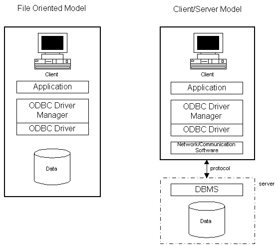 ODBC was designed to work with the client/server model (Figure 2) in order to satisfy the following requirements:
